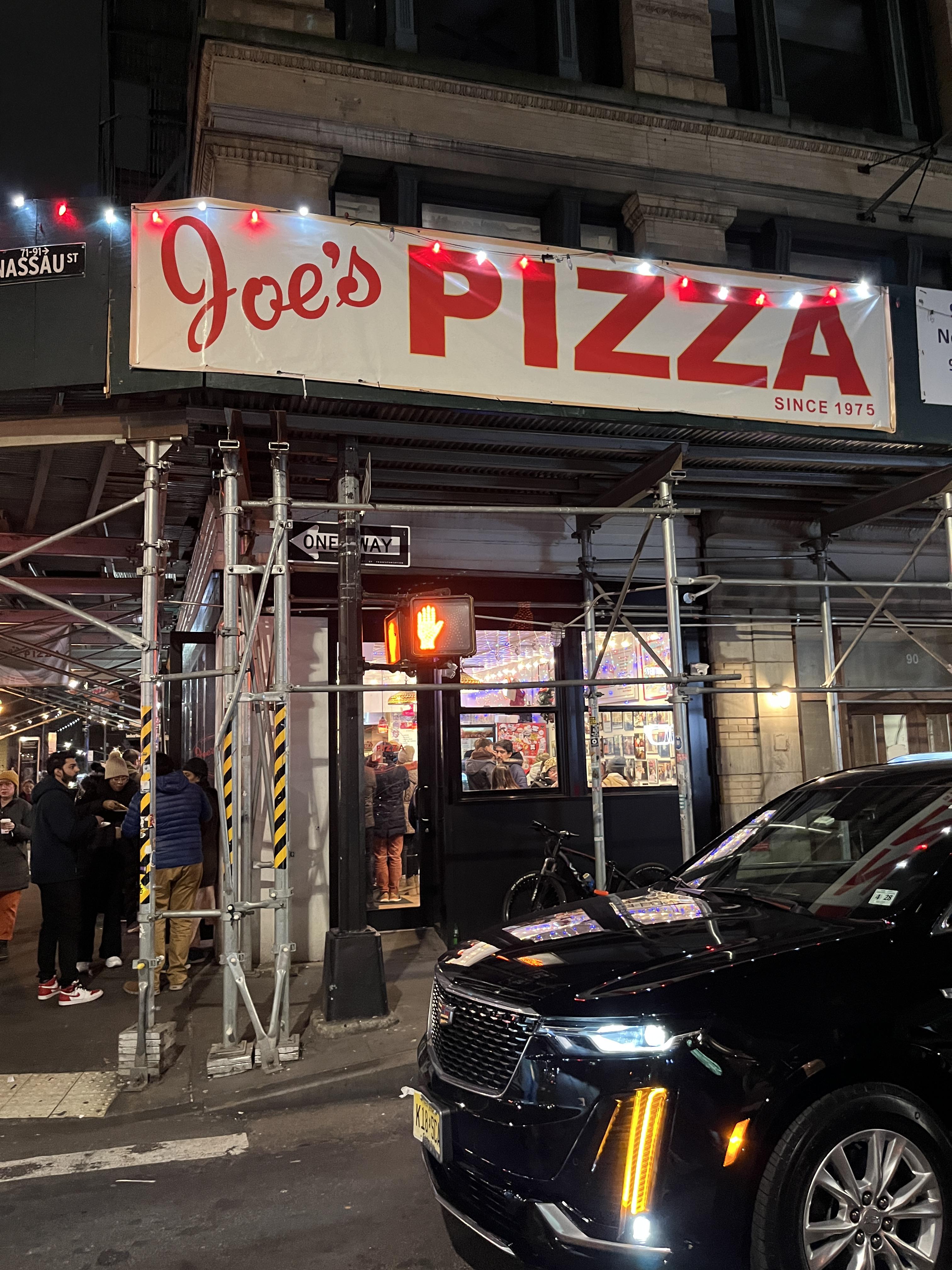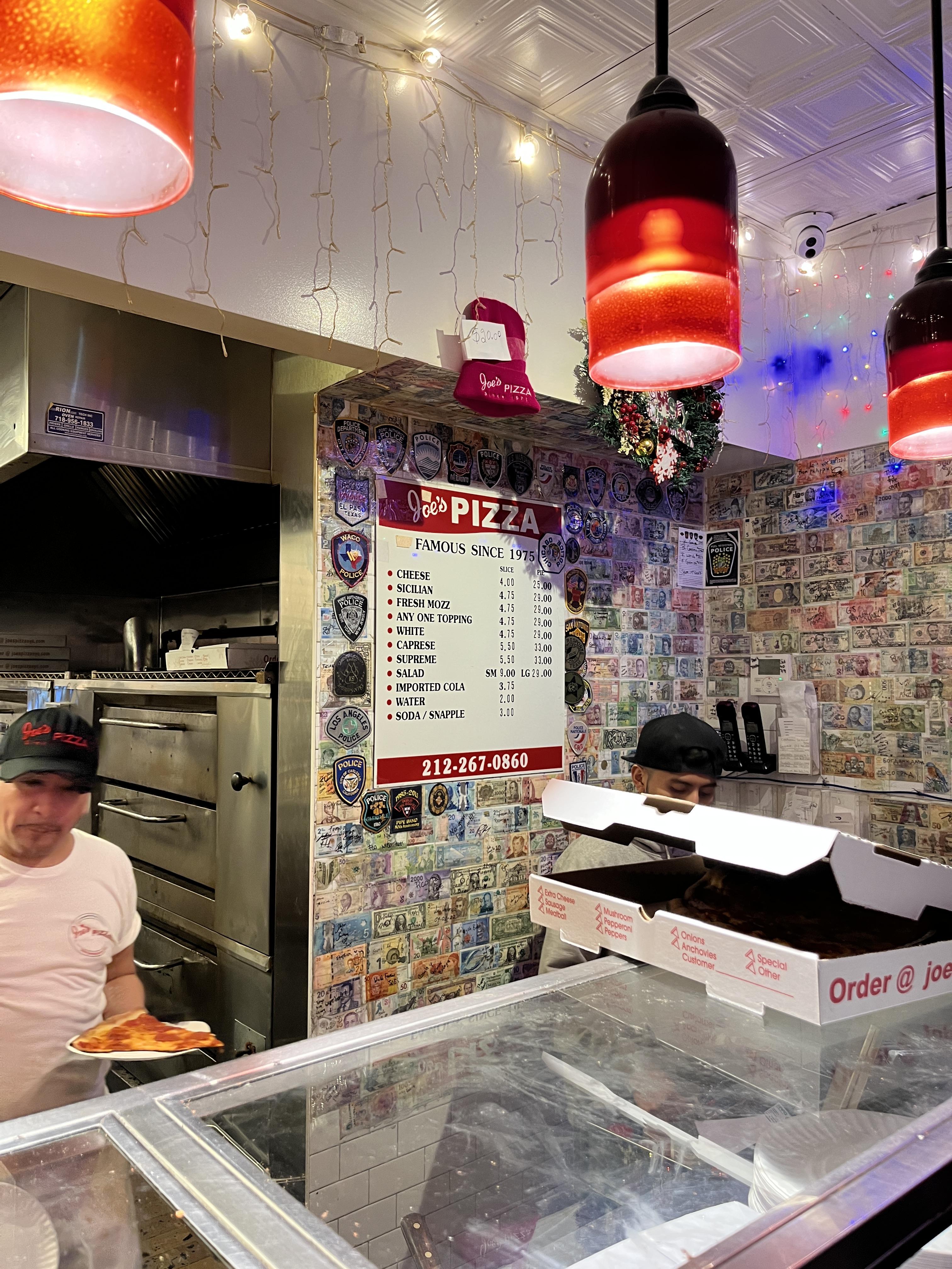 우리가 고른 메뉴는 조스 피자 Joe's Pizza. 뉴욕에 있는 피자집 중에서는 아마 가장 유명한 곳이 아닐까? 지점마다 좀 다르겠지만, 월스트리트 지점은 크리스마스 당일에도 쉬지않고 새벽 3시까지 영업하는 등 아무떄나 갈 수 있어서 정말 좋았음.