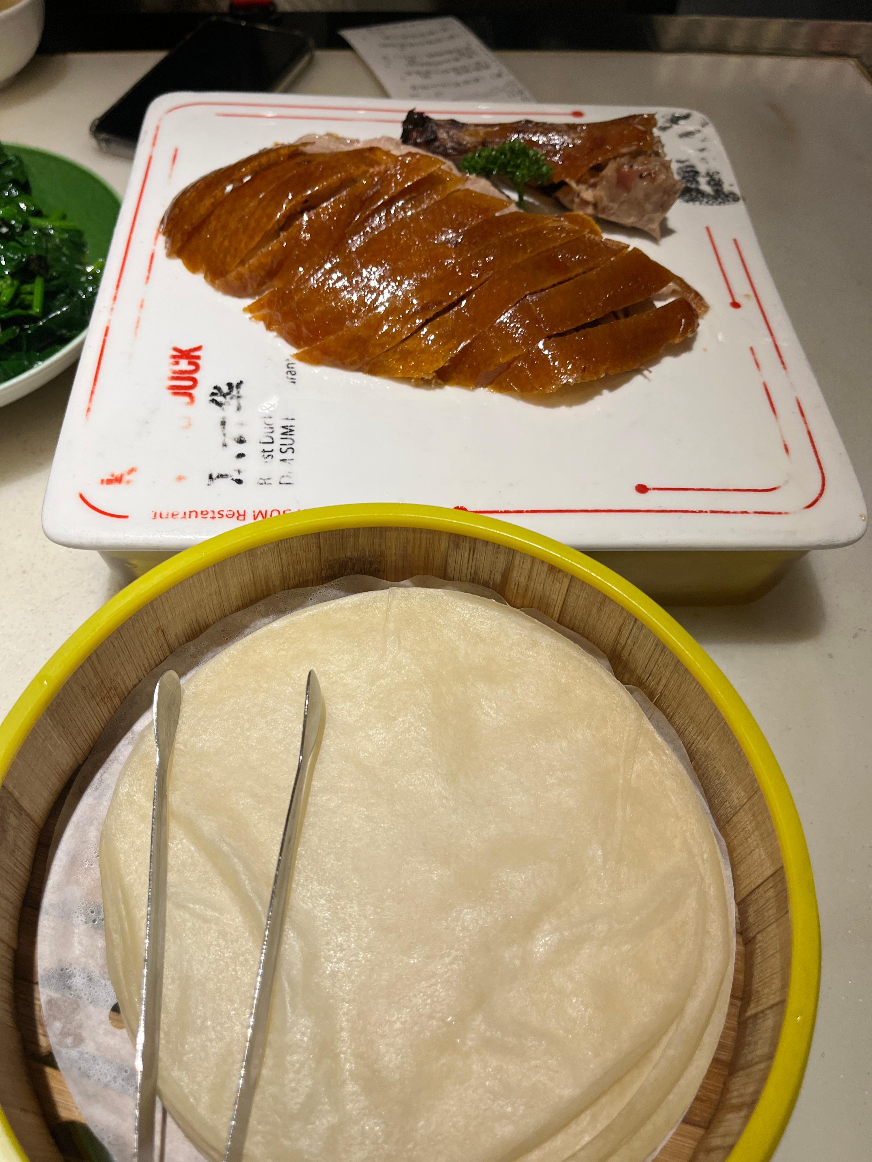 그리고 나온 베이징 덕과 밀전병. 가장 맛있는 껍질과 가슴살 부분으로 서빙된다. 2~3인 세트에는 딱 반마리가 나오는데, 맛보기로 먹기에 딱 좋았다. 이리저리 찍어먹고 싸먹고 하다보니 반마리 다 먹어버렸음.