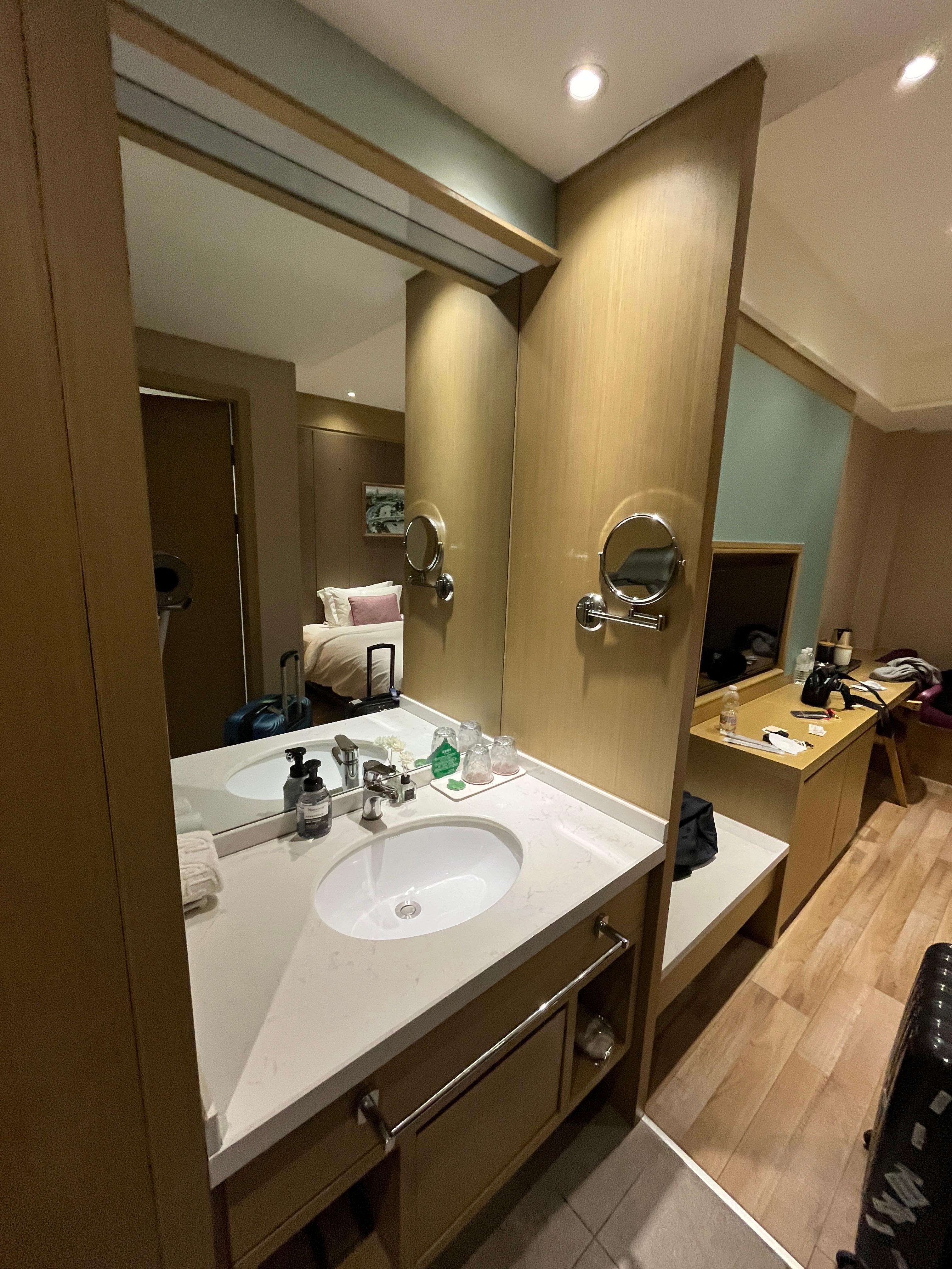 보통 세면대를 밖으로 빼는 구조는 화장실이 좁을 때나 사용하는 방식인데... 근데 또 방이 좁지는 않았다.