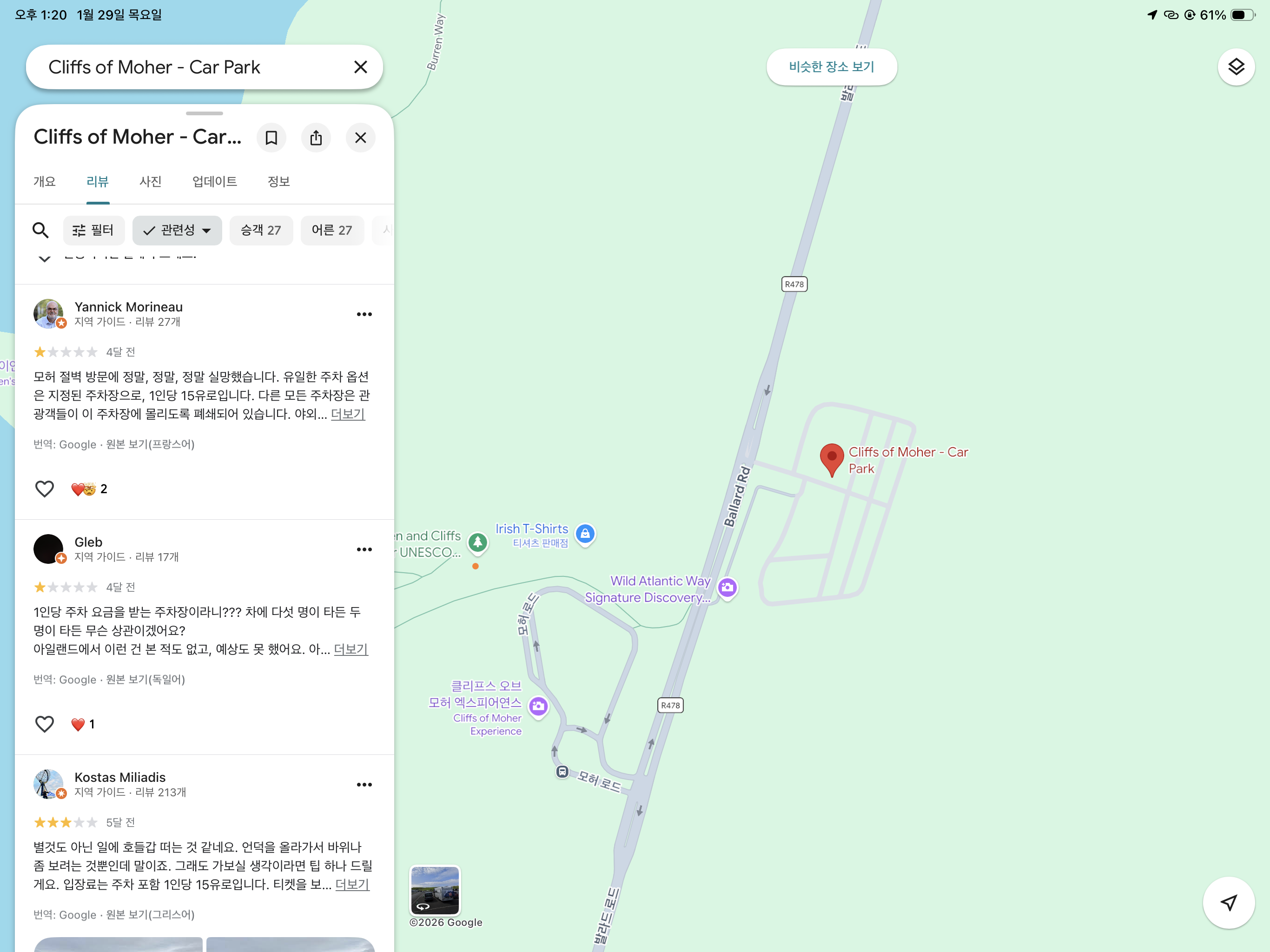 푹자고 일어난 아침, 사람들 붐비기 전에 방문하기 위해 서둘러 길을 떠났다. 여행을 준비하며 찾아보다가 아주 신기한게 있었는데... 클리프 오브 모허 주차장의 리뷰 평점이 3.1점인것.